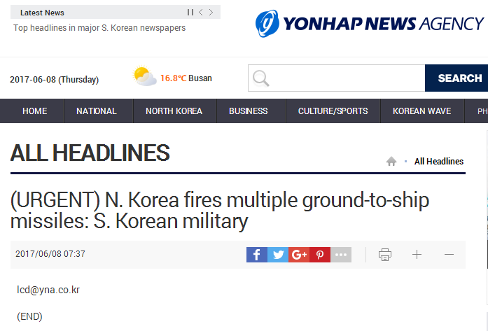 【环球网快讯记者丁洁芸】据韩联社6月8日报道,朝鲜今早在江原道元山一带朝向半岛东部海域发射多枚疑似地对舰导弹的飞行物。联参知情后立刻向韩国总统文在寅汇报相关情况。