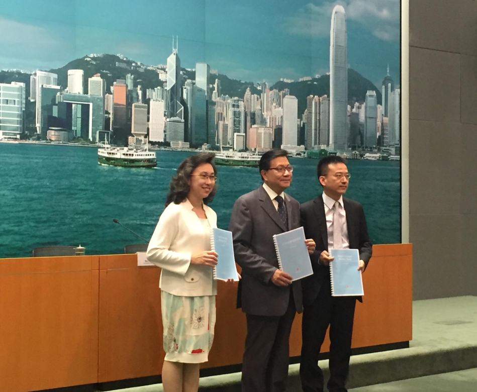 特區政府公布新一份《公共交通策略研究》以完善公共交通服务,左起:运输署署长杨何蓓茵、運輸及房屋局局長張炳良、运输及房屋局副秘书长陈帅夫。
