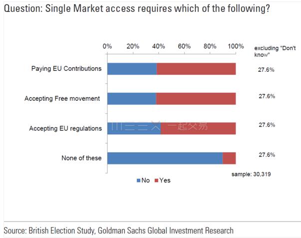 高盛認為談判會成功的信心一方面來自于相信保守黨將會以伴隨著席位增加的方式勝選。正如上文所說,這意味著特蕾莎梅有更多的操作空間,對歐盟27國作出一些讓步,來讓過渡協議順利達成。另一方面,英國選舉調查顯示大部分的英國民眾對于過渡期間英國依然準入歐洲單一市場的代價還是有所覺悟的。
