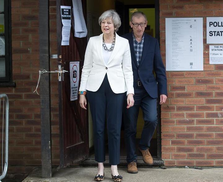 6月8日,在英國桑寧,英國首相、保守黨領導人特雷莎·梅及丈夫投票后從投票站走出。新華社發(蒂姆·愛爾蘭攝)
