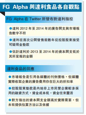 前日沽空機構FG Alpha Management創辦人Daniel David公開質疑達利食品財務狀况,指達利的經營開支及薪資遠低於上市同行,低到難以置信的水平,控達利在2014年至2016年的廣告開支為內地食品龍頭旺旺(151)的兩倍,但點擊率排名卻一直下滑,懷疑其集團在多項財務數據及營運開支造假。他又指出,在國家稅務總局與國家工商總局備案信息中,達利(中國)與福建達利不符,發現達利在首次公開發售前數年從控股股東接受可疑現金墊款,以及資本開支低於達利所呈報的金額。