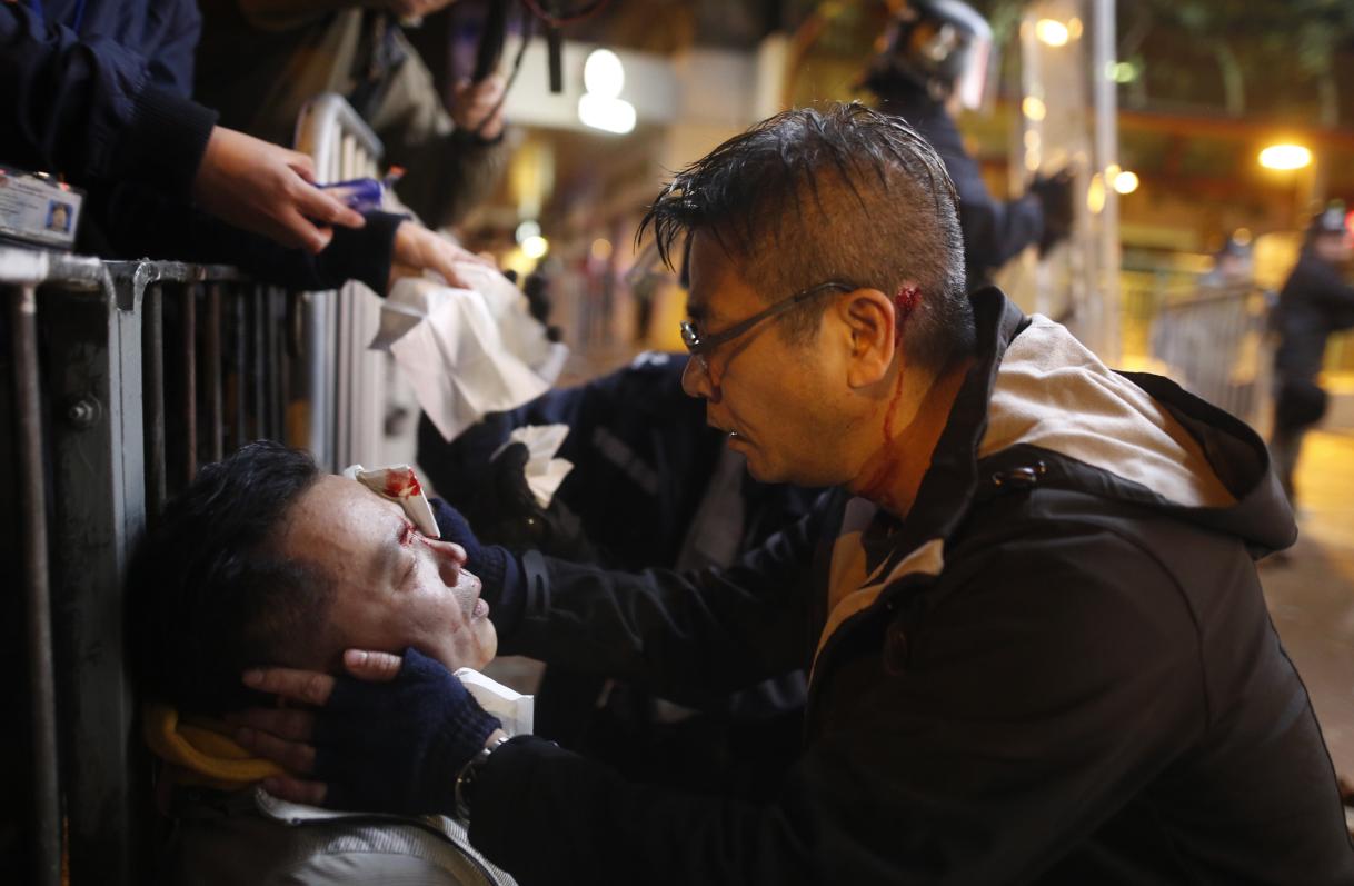 有媒体当晚在旺暴现场摄得警司陳偉基头部被磚掟伤,仍照顾同被磚掟伤的警员黄乐安。