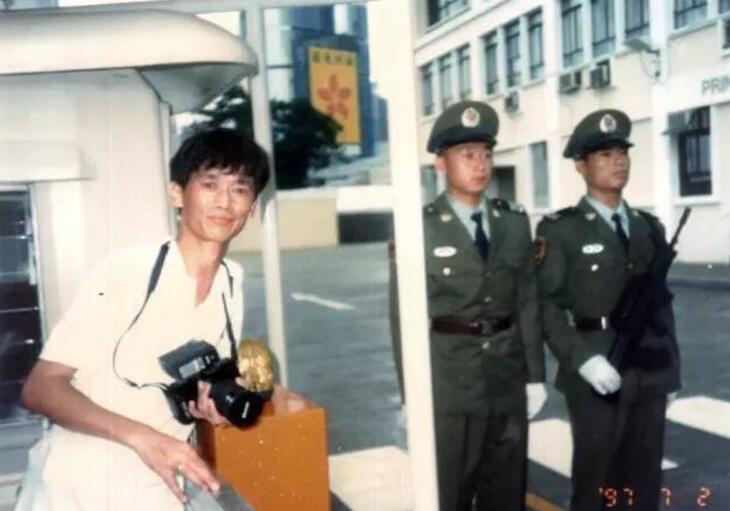 6月30日下午,我爬坡來到位於香港中環的港督府(後作香港特首的禮賓服)區域。一個彭博社的記者(來自澳洲)一個人扛著攝影器材,氣喘籲籲,我替他扛了攝影架。很多人在港督府掛著英皇標志的門邊,攝影留念。我也給這位記者,拍了一張。他要采訪我,以作回報,被我拒絕了。
