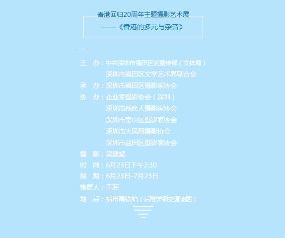記錄、見證、傳承,都是攝影藝術獨特的意義。在香港回歸20周年的特別日子裏,攝影藝術家吳建斌,以他鍾愛的攝影藝術作品見證曆史,致敬風和日麗和風雨兼程的歲月!工作、生活在香港的他,熱愛攝影藝術幾十載,並且堅持拍攝香港不斷變化的新面貌,深入人們生活的點滴,敬畏生命,心系曆史。大到政治事件的捕捉,小到普通生活的畫面,他始終相信影像對於曆史的生命力和意義!
