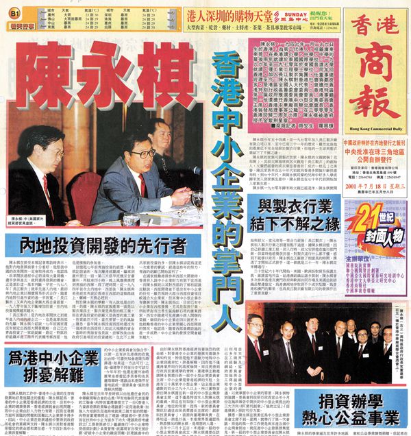 香港回歸祖國3周年之際,陳永棋亦曾接受本報專訪。圖為2001年7月18日部分頭版版面。資料圖片