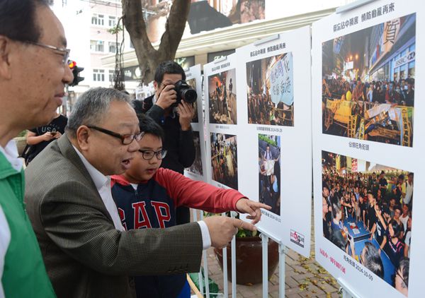 2015年11月15日,陳永棋與外孫參觀反「占中」一周年圖片展。資料圖片