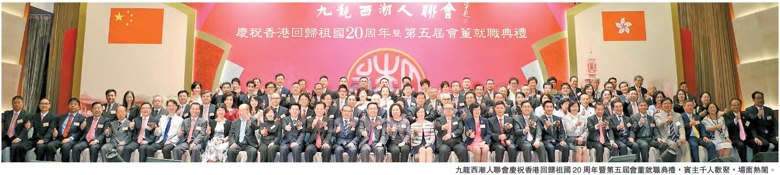 【香港商報网訊】記者謝巧玲報道:九龍西潮人聯會慶祝香港回歸祖國20周年暨第五屆會董就職典禮日前假龍堡國際賓館胡應湘宴會廳隆重舉行,中聯辦九龍工作部部長何靖、食物及衛生局副局長陳肇始、香港潮屬社團總會主席陳幼南、潮州市政協主席楊志明、汕頭市委統戰部部長陳麗文、潮州市委統戰部部長徐和等蒞臨主禮,與近千嘉賓鄉親共同見證新屆會董的誕生。新任會長潘陳愛菁承諾帶領同仁鄉親,秉承聯會宗旨,為會務發展貢獻智慧和力量。