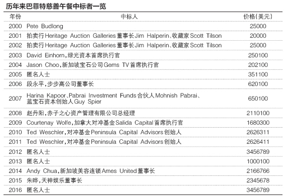 在過去17場巴菲特慈善午餐競拍中,有3名來自中國的中標者獲得了與巴菲特共進午餐的機會,分別是步步高董事長段永平、赤子之心資產管理公司總經理趙丹陽、天神娛樂董事長朱曄。他們3位的競拍價格之和達到508萬美元,占了17次競拍金額總和的近四分之一。