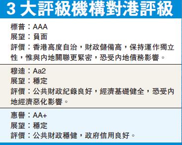 值得關注的是,另一評級機構穆迪上月宣稱,將內地信貸評級從「Aa3」下調至「A1」。因穆迪預期內地財政狀況在未來幾年會有所惡化,經濟增速將會減緩,整體經濟負債水平會繼續增長,未來幾年中國財政實力會減弱。而由於香港在經濟金融和政治等方面與內地聯繫緊密,故穆迪同時亦將香港評級從「Aa1」下調至「Aa2」。但是,兩地評級展望均由「負面」上調至「穩定」。