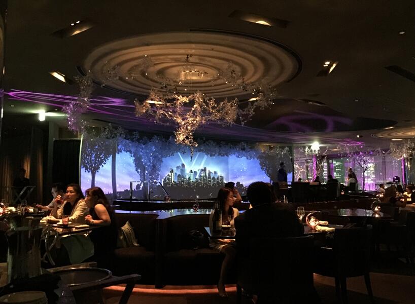 穿過酒吧紫外光隧道走廊,是Peter的用餐位置。這家餐廳的設計非常有特色,中間是升起特別高的一張桌子,高高在上,凸顯VIP的地位,其他桌子星羅棋布分散在餐廳不同位置。所有桌子都能看見餐廳最顯眼的燈影舞台,其實這是用燈光效果製作的一個場景,充滿了夢幻的感覺。