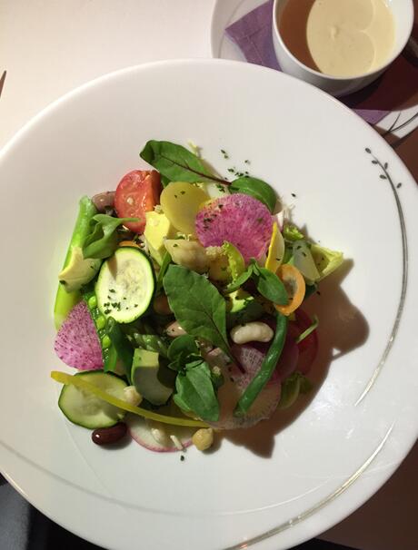 然後頭盤Peter Salad上桌,人生頭一回試用豆腐做的沙律醬汁,讓人驚喜連連,味道清新不膩嘴,而且非常有創造性。另一頭盤吞拿魚Tartar,入口的感覺令人佩服廚師對不同菜式味覺的拿捏是如此恰到好處。廚師不僅加了黑椒,還用了日本芥末,使這道菜的香味更高雅。