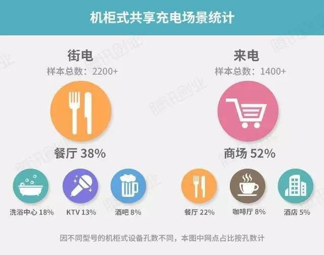 ·机柜式充电宝的网点分布出入较大:街电主要分布在餐厅和洗浴中心、KTV,而来电在商场的网点则超过一半。
