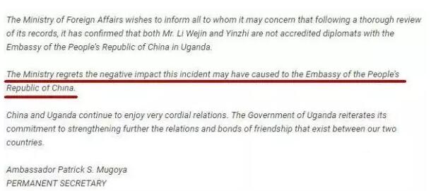 為緩和因此緊張的兩國外交關系,烏干達政府于12日發布聲明文件,向中國道歉。