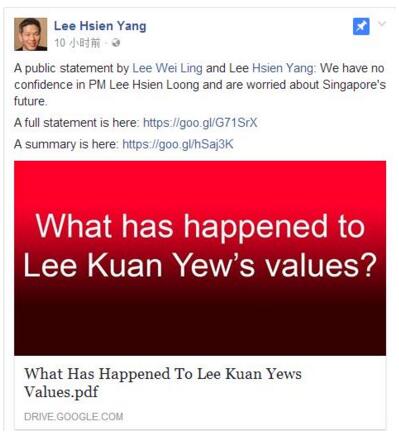 据悉,李瑋玲和李顯揚是李光耀的遺囑執行人,針對李光耀故居處置的分歧,兩人今天凌晨3時同時在各自臉書以《李光耀的價值觀哪去了?》為題發表聯合聲明,表示對李顯龍失去信心,并對新加坡的未來感到擔心。