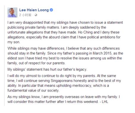 “兄弟姐妹之間可能存在分歧,我認為這些分歧應該是只限在家庭里。自從我父親在 2015 年3月去世,出于對父母的尊重,身為長子,我盡一切努力處理我們家人之間的紛爭。我弟弟妹妹的公開信傷害了父親的名譽。”