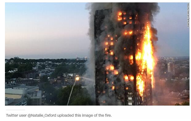 一名推特用戶說,這座“24層樓高的Grenfell Tower被大火吞噬,有人還困在里頭,太恐怖了”。