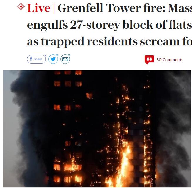 據央視新聞14日援引英國《衛報》報道,倫敦西部一幢24層(另有27層之說)建筑 “格林菲爾塔”(Grenfell Tower)當地時間凌晨兩點半左右(北京時間6月14日9:30左右)發生大火。初步調查顯示,大火是由于四樓住戶冰箱著火引起的。目前火勢正得到進一步控制。