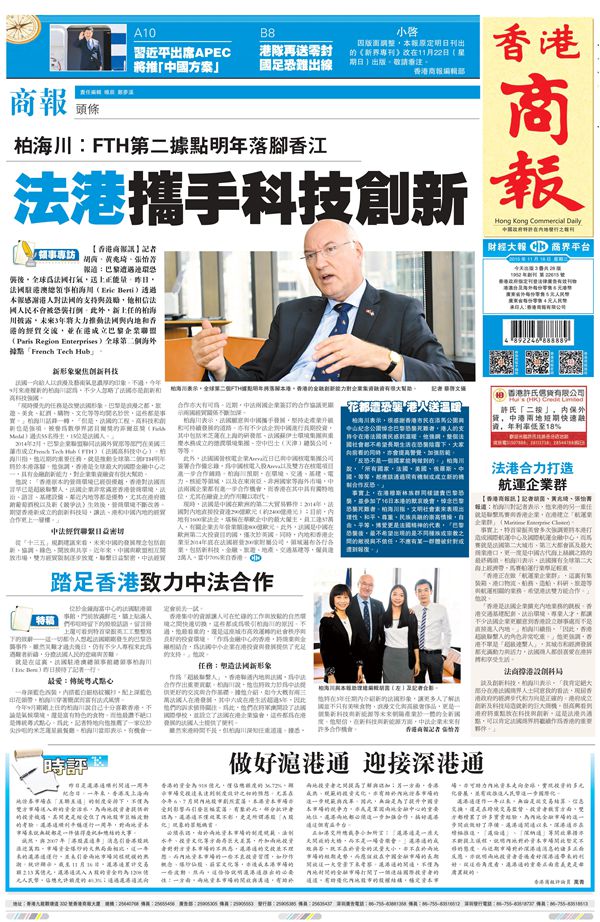 柏海川表示,法國與香港關系匪淺,法國官方在港設政府機構已逾150年,現時約有33000名法國公民在港定居,亦有不同行業的法國企業於本地紮根,如法國巴黎銀行便是其中之一;不少大企業更在港設有辦事處,方便與內地進行生意來往。