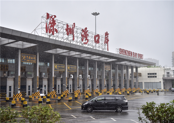 6月13日,一辆粤港两地牌照汽车经过深圳湾口岸。
