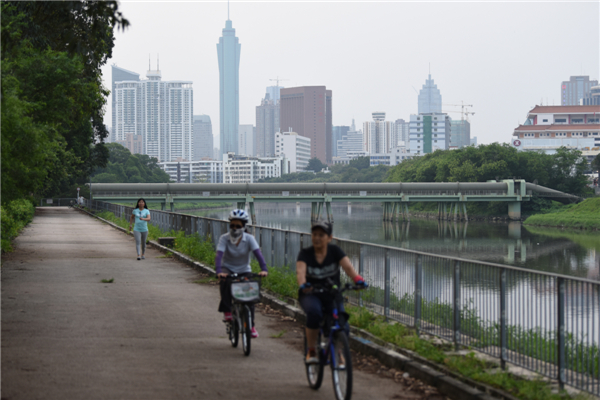 在香港新界河上乡,当地居民在梧桐河畔骑行散步,他们身后是横跨河两岸的东江--深圳供水工程输水管,远处为高速发展的深圳特区(5月17日摄)。