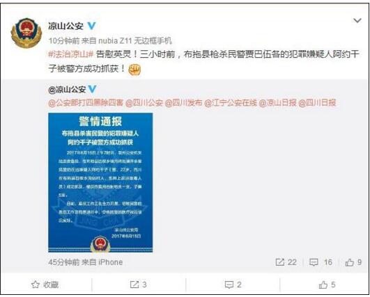 事發后,四川省公安廳、涼山州委、州政府高度重視。目前,我州公安機關已調集增援警力,全力展開緝捕工作。