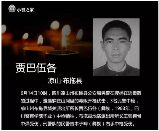 事件發生后,公安機關高度重視,立即成立專案組,全力展開緝捕工作。6月14日凌晨,專案組獲知犯罪嫌疑人行蹤后,隨即對其可能藏匿地點進行搜山圍捕。在搜山圍捕過程中,遭到藏匿于山洞中的犯罪嫌疑人阿約干子開槍伏擊,布拖縣公安局黨委委員賈巴伍各等3名民警負傷,6月14日12時10分,賈巴伍各經搶救無效英勇犧牲,2名受傷民警已送醫救治。