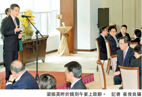 立法會主席梁君彥昨在午宴上首先致辭表示,在過去5年,CY為香港市民服務,維持香港繁榮發展,并在房屋、基建、扶貧、環保等方面改善民生,作出不少貢獻。他又祝願CY在往后不同領域能夠縱橫自如,繼續發揮才能,服務市民。