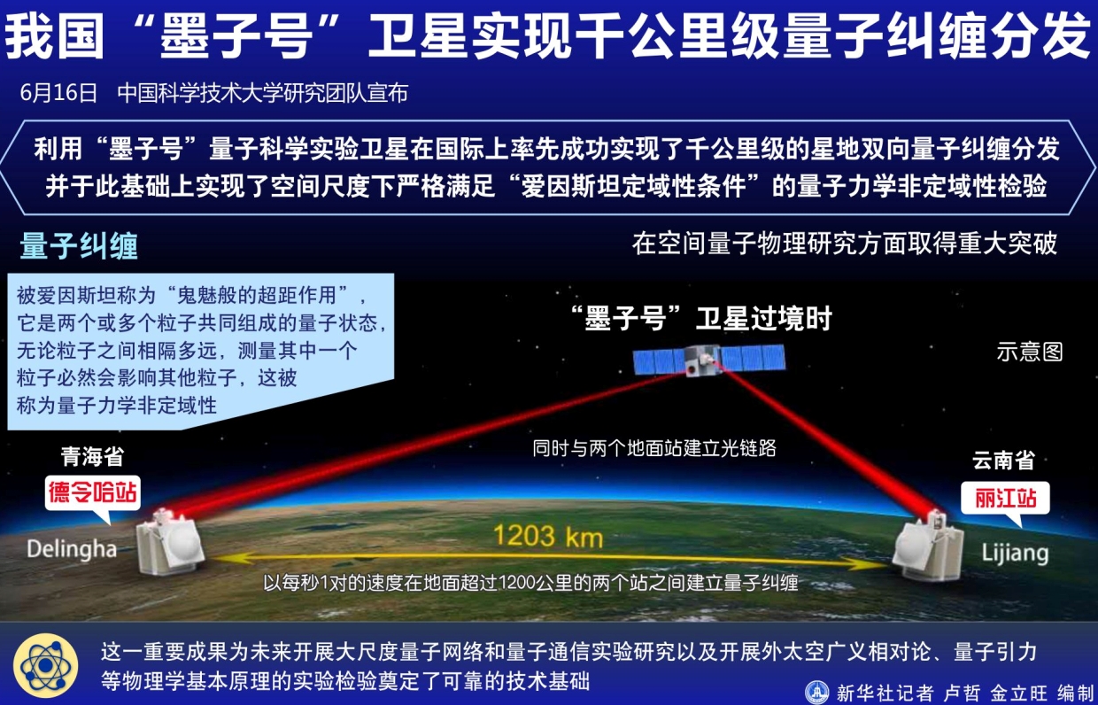 【香港商報网訊】在中科院空間科學戰略性先導科技專項的支持下,在軌運行10個月的世界首顆量子科學實驗衛星「墨子號」,近期在空間量子物理研究方面取得重大突破,在國際上率先實現千公里級的星地雙向量子糾纏分發,將量子糾纏分發的世界紀錄提高了一個數量級。這一突破在6月16日的《科學》雜誌上以封面論文的形式發表。