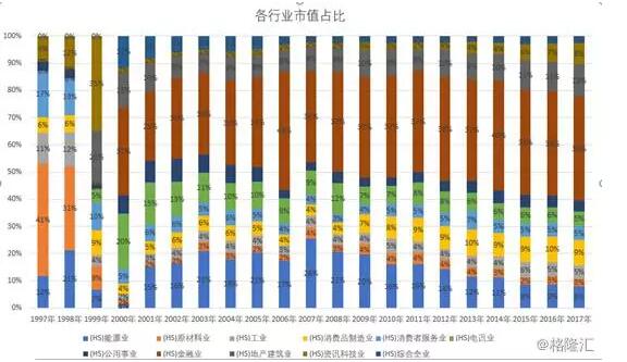受困於“制度依賴症”的港股,香港在新興產業方面的發展是遠低於同時代的發展的(見下圖香港股市更行業市值變遷)。無法想像,如果不是2004年留下了中國互聯網遺珠:騰訊,去掉騰訊的恒指又是怎樣一個走勢?