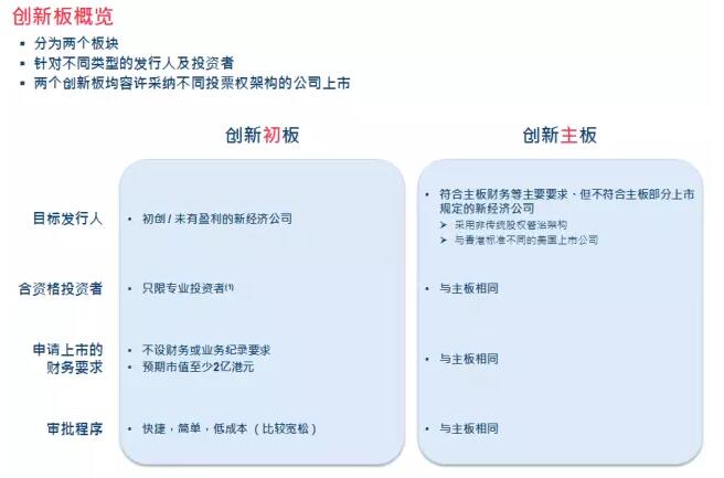 創新主板將對散戶開放,因此會采取與主板相似的監管方針。創新初板將類似內地的新三板,將僅限專業投資者進入,因此上市要求會“比較寬松”。為了確保市場質素,創新板兩個板塊均設快速除牌機制。
