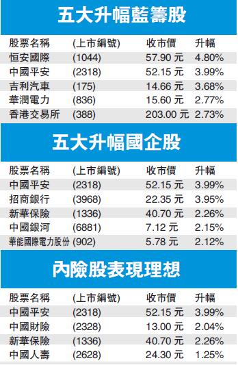 港股昨天成交偏弱,惟股份升勢全面,當中憧憬A股入MSCI,內險股及券商股顯著受惠。中國平安(2318)飆4%,是表現最佳國指成分股;中國財險(2328)及新華保險(1336)升逾2%;中國人壽(2628)升1.2%。券商股方面,海通國際(665)及國泰君安(1788)均升約半成。