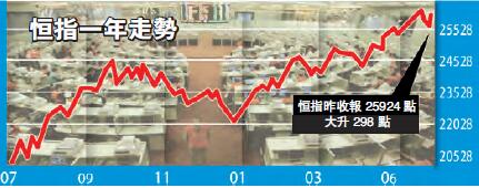 恒指昨高開過百點后升幅擴大,一舉升穿10天及20天線,收報25924點,升298點或1.16%,惟成交僅656億元,是6月首次不足700億。中通社