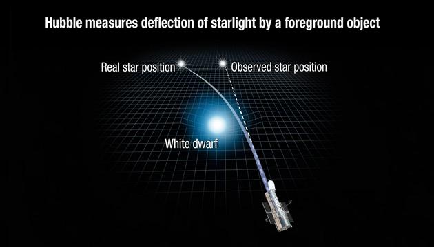 奥斯华尔特强调称,基本原理是背景恒星位置产生的明显偏差将直接表明了白矮星Stein 2051 B的质量和引力,以及这两颗天体的“亲密程度”。这种效应叫做“引力微透镜效应”,对于遥远天体,引力起到放大镜的作用,能够弯曲恒星光线,因此恒星光线出现了闪烁。