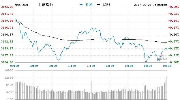 新浪財經訊 6月20日消息,滬深兩市早盤雙雙高開,隨後再現八二格局,滬指受保險股下挫拖累持續在平盤線下方震蕩,臨近早盤收盤回升翻紅,創指高開高走,一度漲近1%,午後受阻於60日均線震蕩回落,兩市尾盤均出現跳水。截止收盤,滬指報3140.01,跌0.14%,創指報1820.98,漲0.25%。
