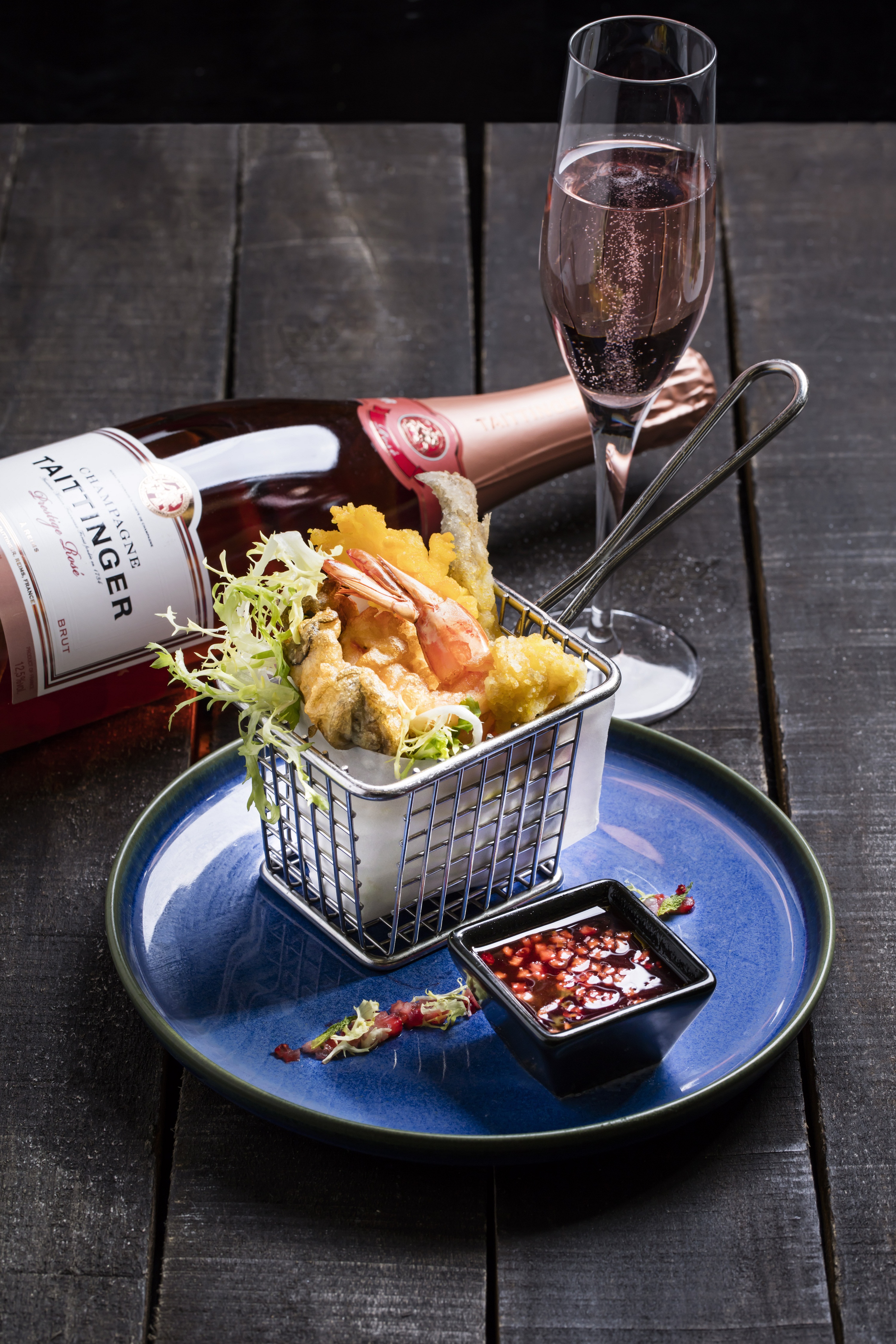 炸至金黃香脆的海鮮蘸點士多啤梨汁,再呷一口玫瑰香檳,滿口果香。