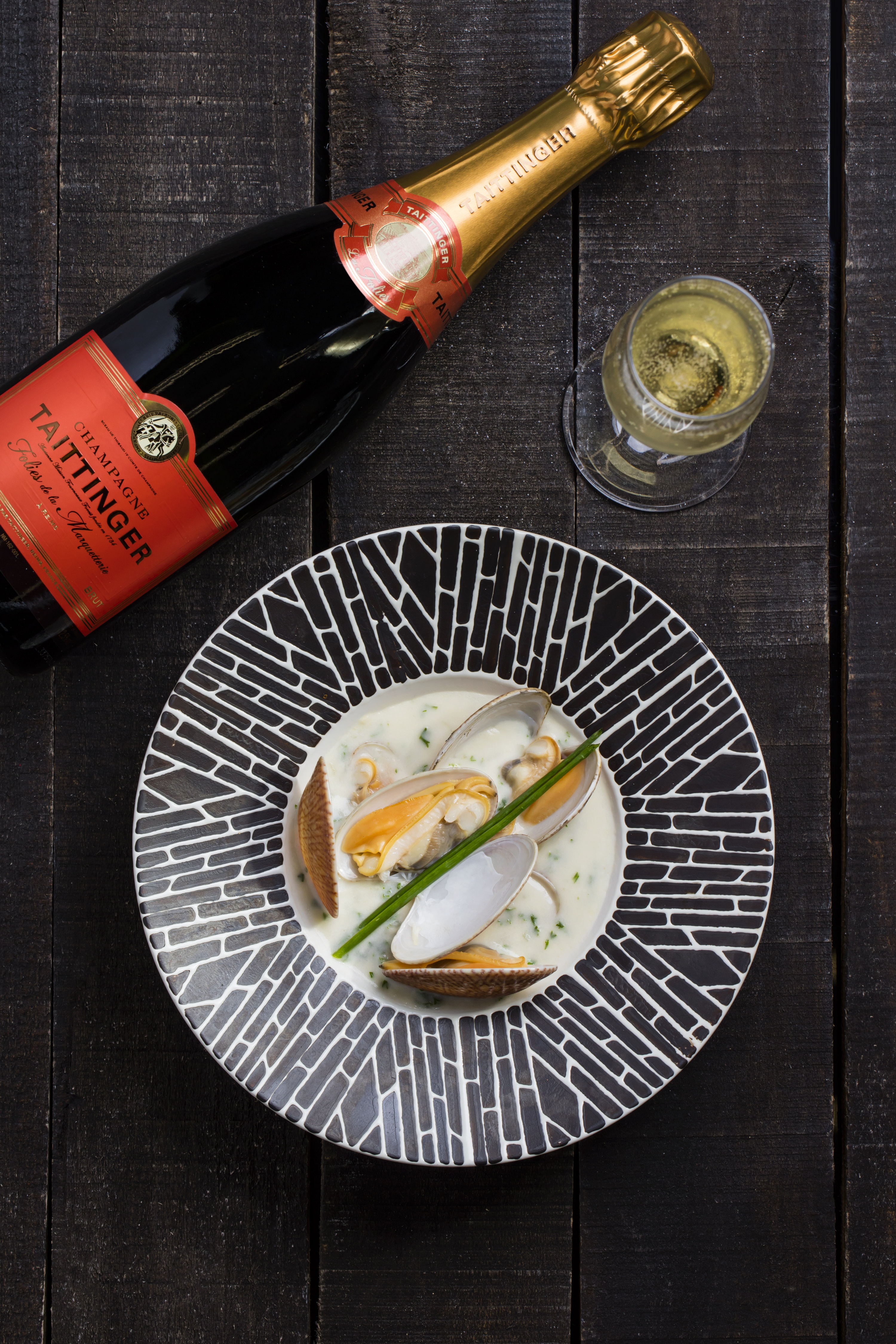 香檳和海鮮素來是一對好拍檔,這裏的蒜香月桂香檳蜆即叫即做,不單止有香檳配飲,還加入香檳以近年大熱的慢煮方法烹調,令蜆肉口感變得更嫩滑,加上忌廉牛油烹調成醬汁,味道濃郁。配以帶有杏桃及微微煙燻香的Taittinger, Folies de la Marquetterie, N.V.,正好與忌廉牛油醬汁相輔相成,複雜的餘韻令人回味。