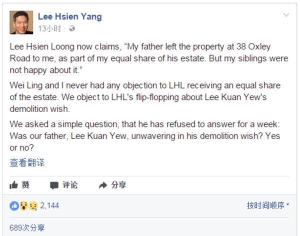 6月14日,李光耀的女兒李瑋玲和小兒子李顯揚,在社交網絡上發表公開信,指責其大哥——新加坡現任總理李顯龍違背李光耀的遺愿,文中“失去信心”“建立王朝”一類用詞讓人印象深刻。公開信的標題叫做:《李光耀的價值觀何在》。