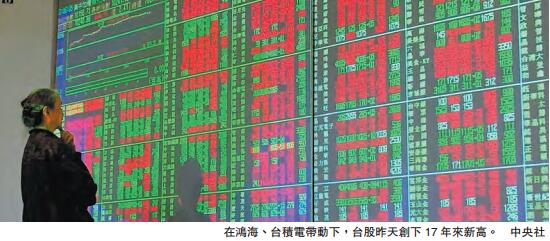 【香港商報網訊】台股指數昨天高開高走,隨著台積電、鴻海雙雙創出波段新高,台指最高點達10354點,再創2000年2月以來17年高記錄。鴻海盤中最高也達到每股115元(新台幣,下同),收盤市值飆破1.98萬億元;台積電股價也持續攀高,盤中一度達217元,市值更創下5.62萬億元的記錄,并刷新台股單一上市企業市值記錄。