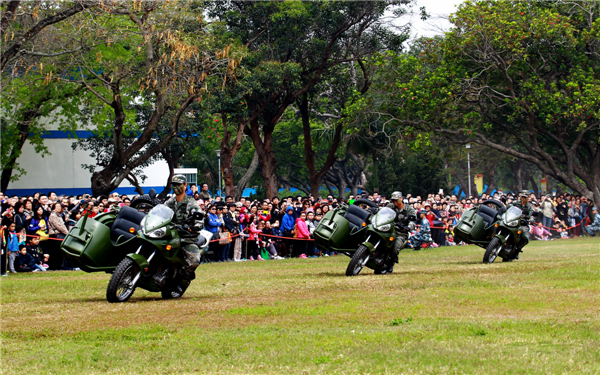 驻香港部队特战队员在“军营开放日”中进行摩托车特技驾驶演练。新华社