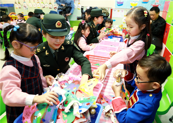 驻香港部队官兵走进驻地幼稚园,开展“关爱幼童”公益活动。新华社