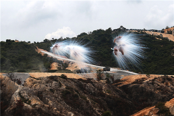在“香江卫士-2015”联合实兵演习中,步战车施放烟幕弹掩护载员投入战斗(资料照片)。