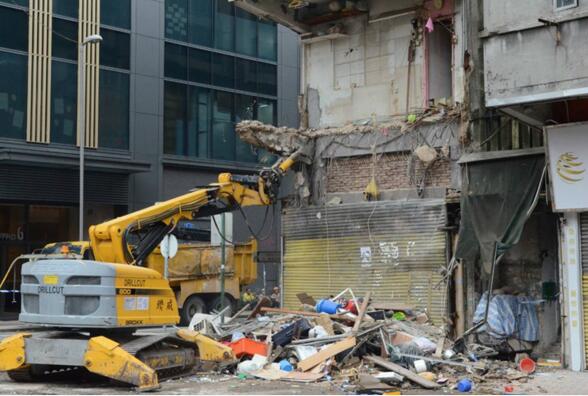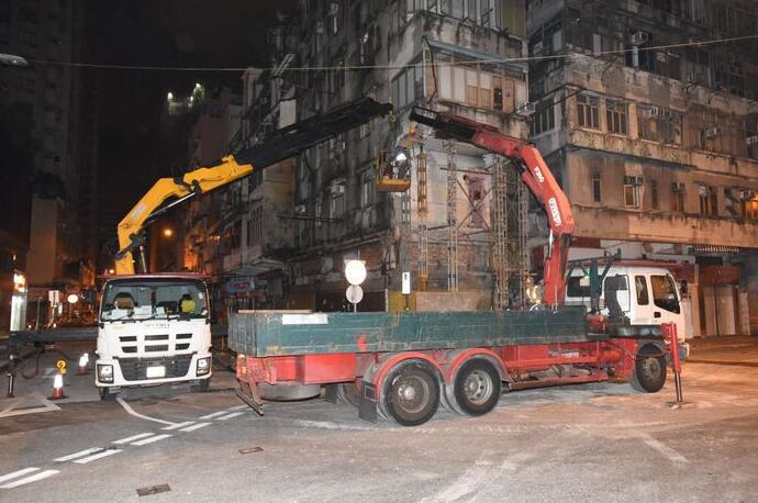 紅磡機利士南路50號唐樓,發生塌樓事故,一樓突然「冧露臺」,石屎半空中「危危乎」,住客險墮樓。屋宇署昨日下午,安排工程車拆除塌陷單位的物品,視察後證實樓宇1樓、2樓及3樓露臺位置有結構危險,需要進行緊急清拆及臨時支撐工程。