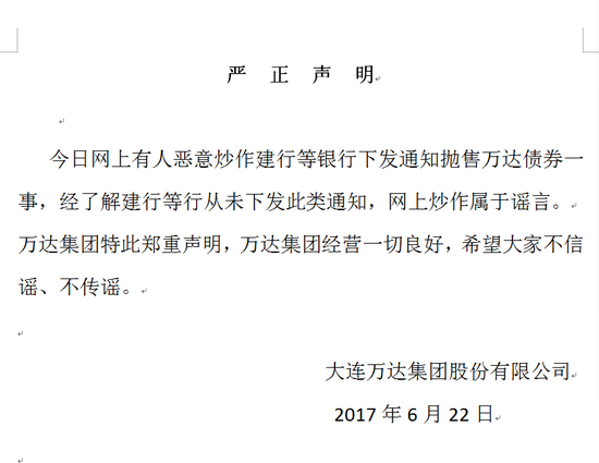 針對市場傳聞,萬達午間發布新聞公告,澄清自己遭到銀行拋售並不屬實。大連萬達集團股份有限公司發布《嚴正聲明》:“今日網上有人惡意炒作建行等銀行下發通知拋售萬達債券一事,經了解建行等行從未下發此類通知,網上炒作屬於謠言。萬達集團特此鄭重聲明,萬達集團經營一切良好,希望大家不信謠、不傳謠。”