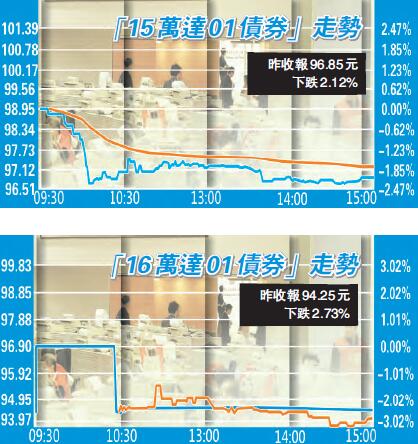 萬達系債券全線跳水:15萬達01跌2.21%,收報96.85元人民幣;15萬達02跌2.96%,收報95.97元人民幣;16萬達01跌2.73%,收報94.25元人民幣。深市萬達電影(SZ002739)插水9.91%,收報51.93元。海外市場方面,萬達2024年到期的美元債券大瀉9%,從112美元一路下挫至101.9美元。