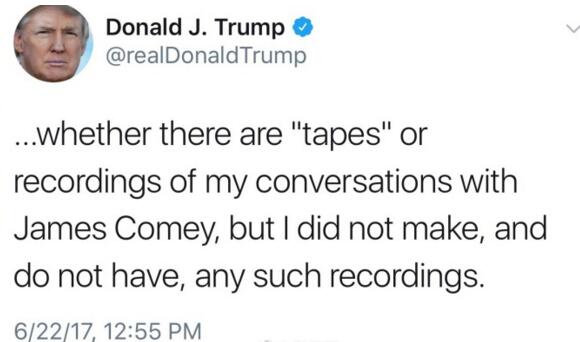 特朗普曾提議,他有他們的談話錄音,顯然是作為一種恐嚇科米的方式。幾個星期以來,特朗普和白宮高級官員均拒絕告訴公眾這些錄音帶是否存在。