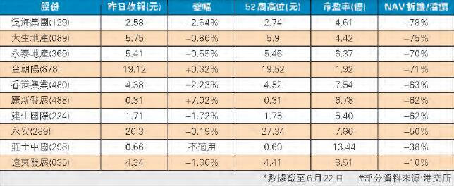 【香港商報網訊】多家大行預言樓價爆煲,只是樓價還是升個不停,中環核心商廈有價有市,住宅單位屢創新高。近月,一線發展地產股隨樓價跑出,二三線中小型地產股亦不遑多讓,大部分股價今年已升20%至30%。其實,港資地產股一直存在大折讓的問題,中小型地產股的折讓更嚴重,若以每股資產淨值(NAV)衡量,大部分股份屬超值,如果樓市繼續癲下去,NAV折讓大的地產股基本上越有上升潛力,泛海(129)及麗新(488)值得憧憬。