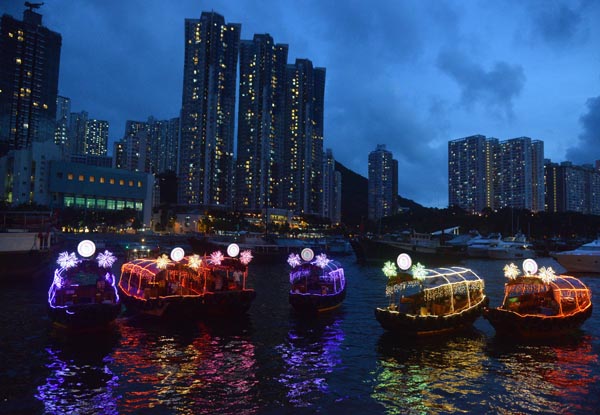 多艘彩艇於香港仔避風塘表演燈光舞。