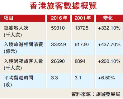 1997年,訪港旅客總數是1040萬人次,旅遊業賺取的外匯是721億元。10年後的2007年,自由行帶動訪港內地旅客呈現突破性增長,訪港旅客達28717萬人次,單是來自內地的旅客是1549萬人次,比1997年的訪客總數多500萬人次。2011年,入境總人數突破4000萬大關,達4192萬人次;與旅遊相關消費總金額突破2500億港元,達2530億港元;內地訪港遊客總人數達2810萬人次,比回歸前增幅超過10倍,穩坐訪港旅遊人次第一把交椅。
