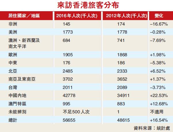 2015年訪港旅客人數有所回落,但仍接待了5930萬旅客,約佔整體訪港人數的77%。2016年訪港旅客共5670萬人次,為本地人口的7.7倍,內地旅客佔總數的76%。訪港旅客繼2016年下跌4.5%後,於2017年1月上升4.8%。內地旅客則繼2016年下跌6.7%,於2017年1月回升7.7%。2016年上半年,與入境旅遊相關的總消費金額為1440億港元,按年下跌13.6%。