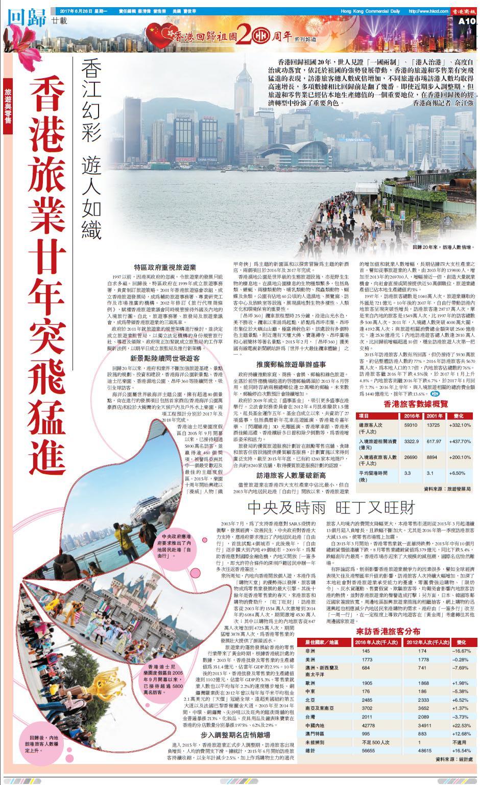 香港回歸祖國20年,世人見證「一國兩制」、「港人治港」、高度自治成功落實,依託於祖國的強勢發展帶動,香港的旅遊和零售業有突飛猛進的表現,訪港旅客總人數成倍增加,不同旅遊市場訪港人數均取得高速增長,多項數據相比回歸前是翻了幾番。即使近期步入調整期,但旅遊和零售業已經佔本地生產總值的一個重要地位,在香港回歸後的經濟轉型中扮演了重要角色。香港商報記者 余江強